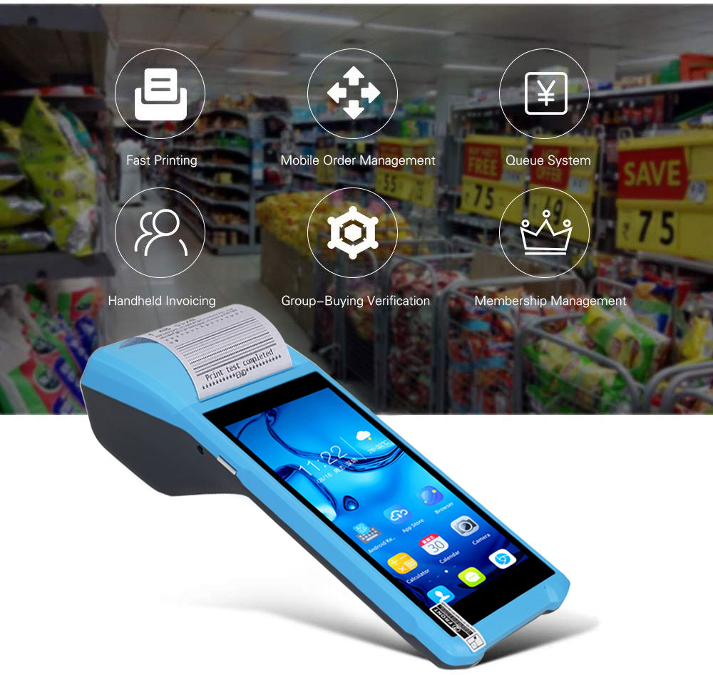 1. Smart handheld pos system, runs as well as receipt printer, camera, supports 3G, Wifi, BT4.0, 8GB/16GB Nand Flash.